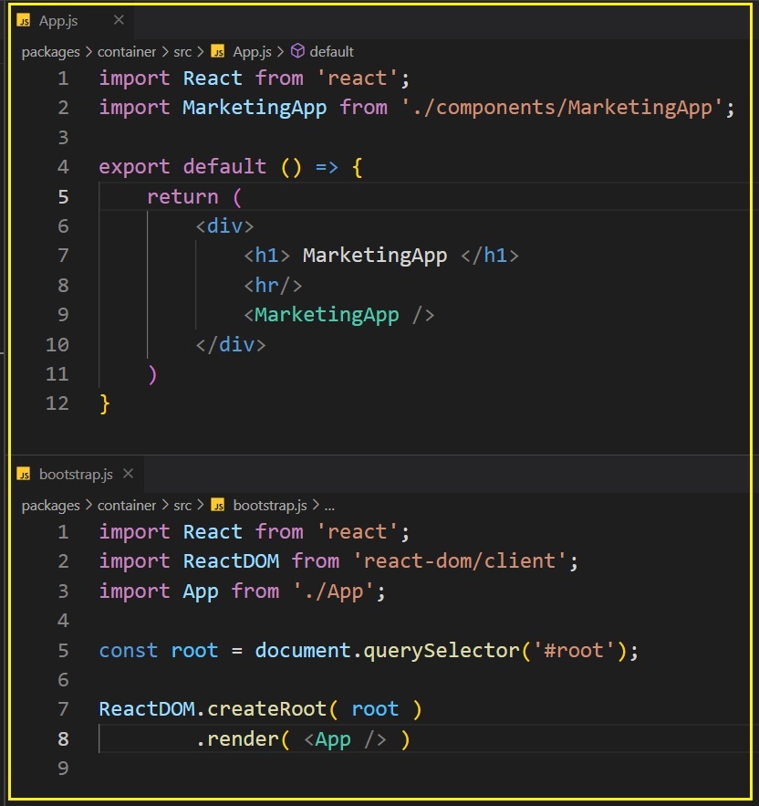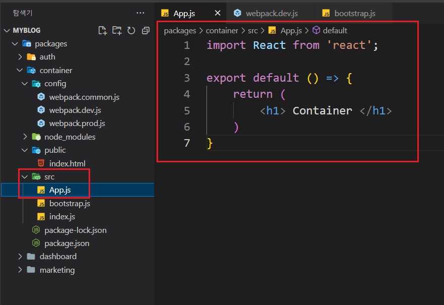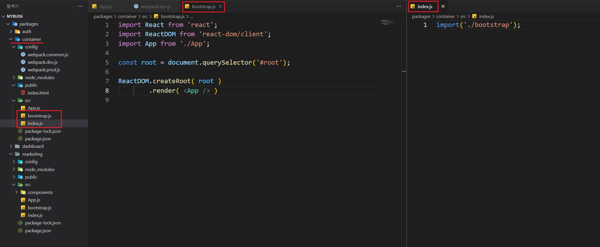 container/src/폴더에 'index.js', 'bootstrap.js'를 생성한다. index.js는 인터페이스 역할이며, 세부적인 기능은 bootstrap.js가 담당한다.