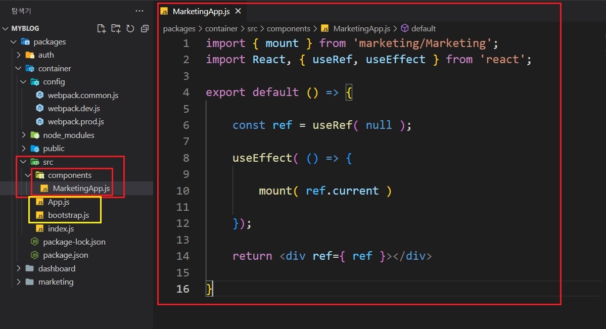 메인화면에는 마케팅 부분이 전면에 나타나야 하므로 App.js는 marketing 하위폴더의 내용을 (리액트의)컴포넌트처럼 가져와야 한다. 이를 위해 src폴더 아래 components폴더를 만들고 'MarketingApp.js'를 넣어준다.