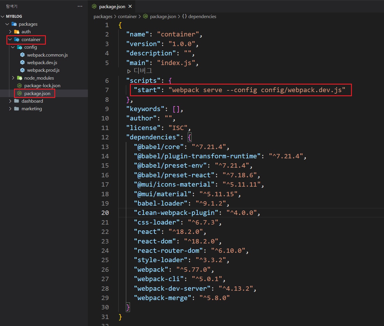 container에서 웹팩을 실행할 수 있는 명령문을 package.json의 scripts값에 넣어준다.